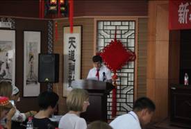 (新疆维吾尔自治区教育厅外事处副处长杨永峰向丝路沿线各国本土汉语教师顺利结业表示祝贺)
