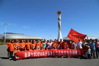 (外国本土汉语教师在新疆冬运会场馆前合影留念)
