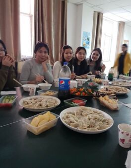 (杨韵韵老师和迪拉热老师与交换班学生共度冬至)